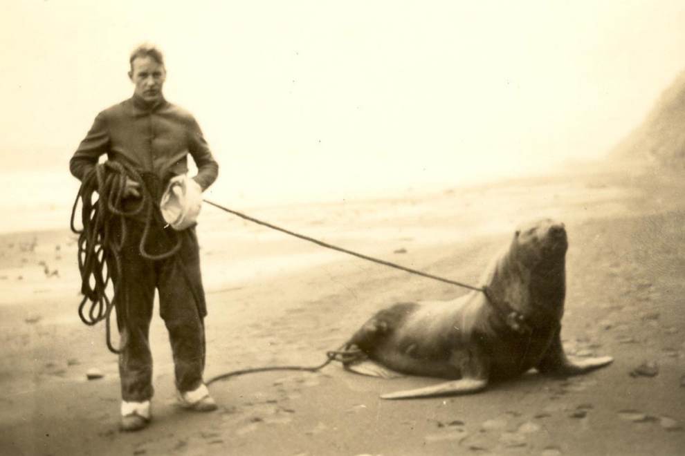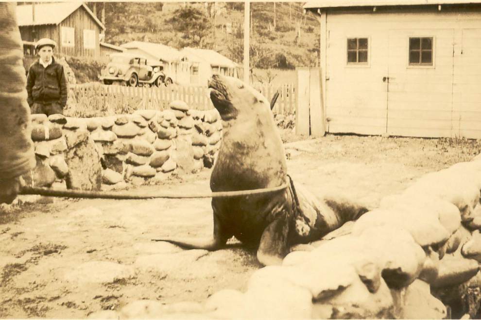During the last week of March 1933, local resident Dave Dewey discovered an injured and battle scared male sea lion on the beach that appeared to be hunting for a cave in which to recuperate. Dave lassoed him and brought him up the ramp in Nelscott with the intention of caring for him until he was well. A fenced in pen was built for him, but every night he would escape by climbing over the picket fence with the greatest of ease, careful not to crush flowers or break flowerpots. By morning he would be seen trying to enter any open door, perhaps mistaking them for the entrance of a cave. He might even be discovered in one of the waterfront houses, much to the alarm of the residents who were obliged to show him out.