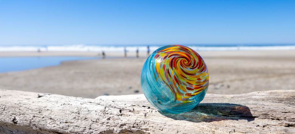 Finders Keepers evolved from the Millennium Float project, which began in the late 1990’s when a group of local glass artists decided to hide handmade floats along the seven miles of Lincoln City beach to replicate Japanese fishing floats that washed up on the shoreline during most of the 20th Century. The dazzling blue and green Japanese floats were used by fishers to hold up their nets, and often the floats would break free and eventually wash up along the Pacific coast. Most of the authentic fishing floats were round and measured in size from two inches to two feet, although some were elongated in the shape of a rolling pin.