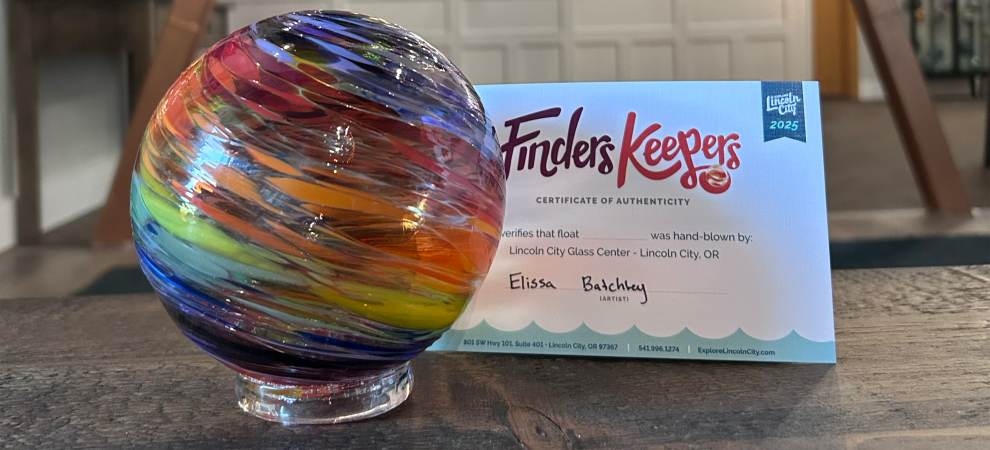 Search the beach for floats anytime from dawn until dusk; floats are placed multiple times throughout the day above the high tide line and below the beach embankment, although many of the people who have discovered them say that they found them when they weren’t even looking. Every hidden float has instructions that explain how to register it online or by phone so that organizers know that the float has been found. Floats can also be registered in person at the Lincoln City Welcome Center, located at 801 SW Hwy 101, 4th floor, open Monday through Friday 8:00 AM - 5:00 PM, and don’t forget to share a photo and brief description on social media. When the float has been registered, Finders Keepers will issue and send a certificate of authenticity and information about the artist who made it. Treasure hunters are asked to limit their search to one float per household, per year, so that others may have the opportunity to find their own float too.